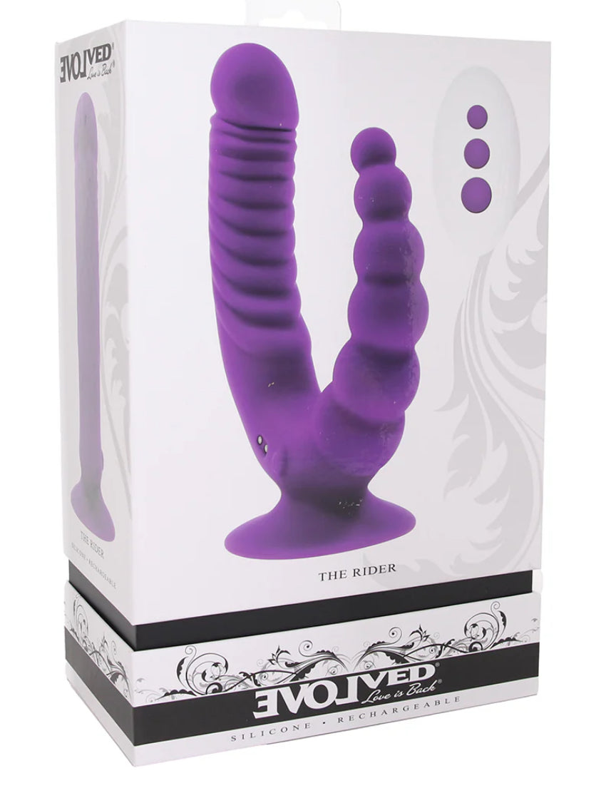 Saddle up for double the action, hands-free and hot as hell! The Double Rider is always up for deep-down double-penetration bliss, no reins required. With a thick, veiny shaft up front and a bumpy butt probe around back, this ultra-flexible vibe moves with your body as you grind, thrust, and bounce.